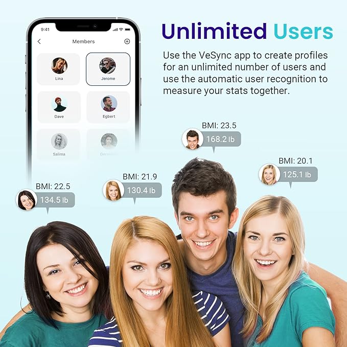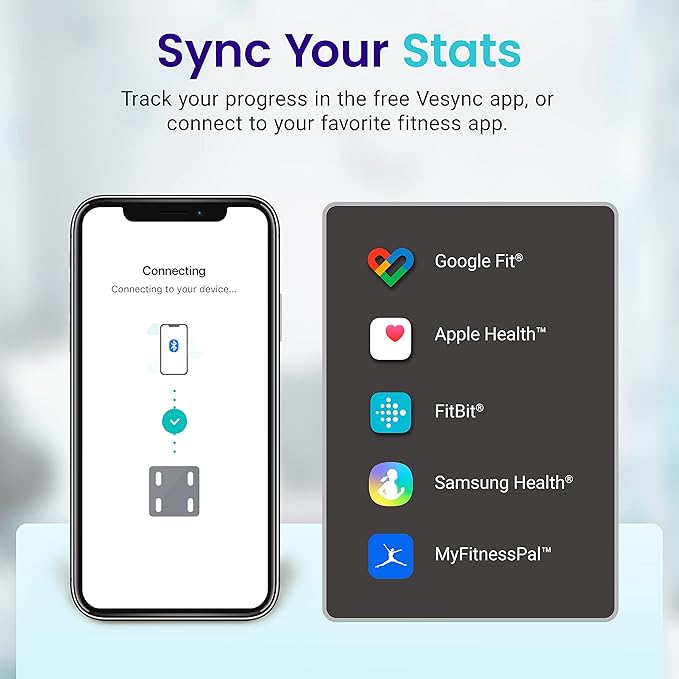 • Weigh Smarter: Pair your scale with the free VeSync app via Bluetooth, to easily track daily/weekly/monthly progress and gain insight into your fitness routine. Rest assured, VeSync will not share your personal information with any third parties