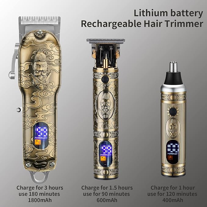 • INCORPORATED LCD SCREEN - Built-in LCD digital display, display remaining power, charging status and lubrication reminder indicator. The hair clipper can be used for 180 minutes after charging for 3 hours. The trimmer can be used for 120 minutes after 1 hours of built-in charging. 2 in 1 nose trimmer and mustache trimming,90 minutes after 1.5 hours of built-in charging.