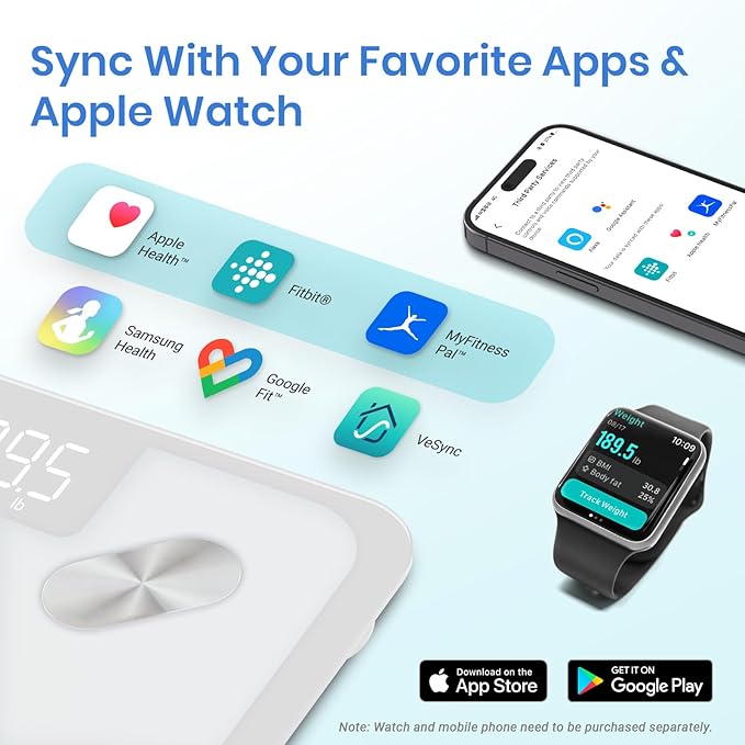 - Use with Ease: Seamlessly integrate our scale into your fitness routine. Compatible with APPLE WATCH and syncs data with popular fitness apps like Apple Health, Samsung Health, Google Fit, FitBit, and MyFitnessPal. Supports unlimited users for convenience