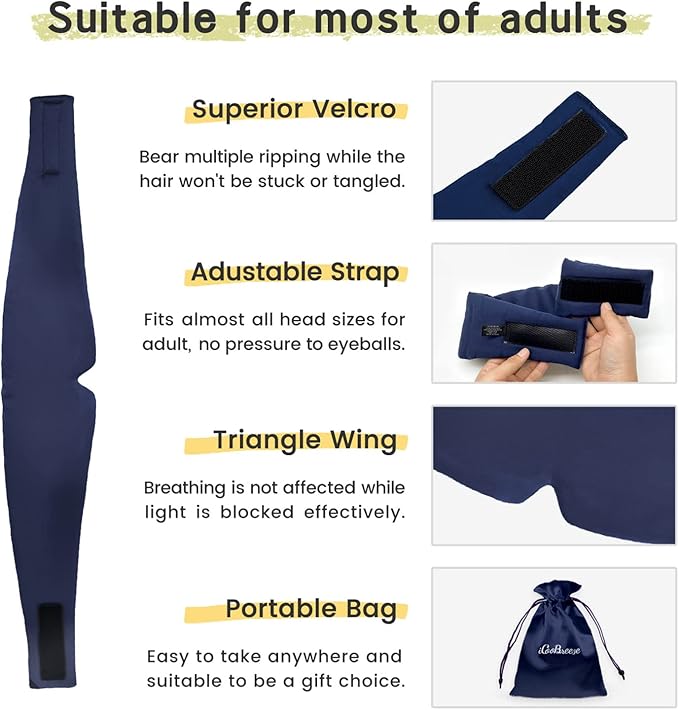 - Large Size & Adjustable: The eyemask is with Large Size to fit most head circumference and side-sleepers. You may adjust the strap to your suitable length via the Velcro, and the mask will no shift off easily. You won’t feel any pressure on your face or your eye balls with this sleep face mask, and we believe that you will want to use it in the long term