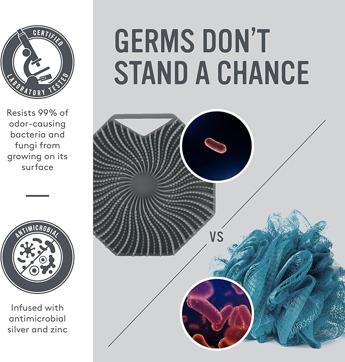 • ANTIMICROBIAL - Compared to cheap silicone scrubbers that claim to be hygienic, Sud Scrub is the only silver and zinc-infused silicone shower brush that is proven to resist 99% of odor-causing bacteria and fungi from growing on its surface.