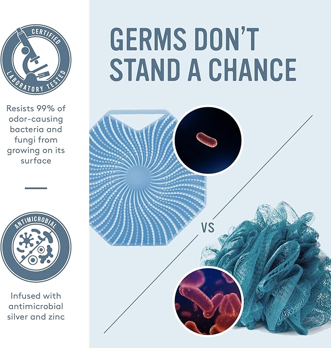 • ANTIMICROBIAL - Compared to cheap silicone scrubbers that claim to be hygienic, Sud Scrub is the only silver and zinc-infused silicone shower brush that is proven to resist 99% of odor-causing bacteria and fungi from growing on its surface.
