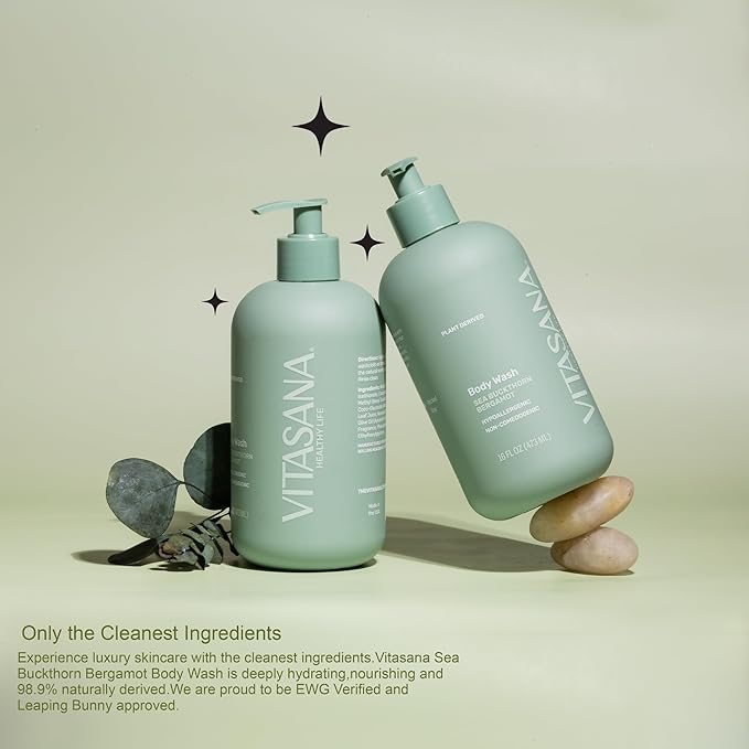 Vitasana Natural Body Wash for Sensitive Skin, 16 oz – Sea Buckthorn & Bergamot Scent, 98.9% Plant‑Derived, EWG Verified, Hypoallergenic, Paraben‑Free, Sulfate‑Free, Cruelty‑Free
