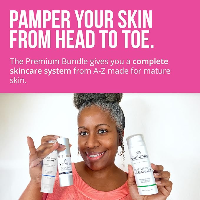 • Premium skincare - The ultimate self care kit for mature skin, the Vibriance Premium Bundle includes our all-in-one Super C Serum, ultra gentle Moisturizing Cleanser, super light-weight Moisturizing Cream, Sheer Zinc Sunscreen, and Age Defying Body Serum, all in one pack.