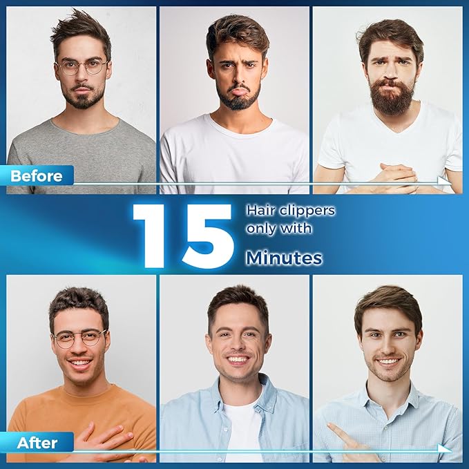 - [5H+ Cordless Hair Clipper] With only 3h fully-charged for 2500mAh ultra-powerful battery, you can use the cordless men's hair clippers for half a year(More than 15+ times cordless trimmings). Only with 15min charge, you can get 1 full cordless cutting. Quick charge leaves you plenty of time to clean yourself up before your urgent big meeting/party/formal occasion. The smart LED display also indicates the battery level and reminds you to charge it