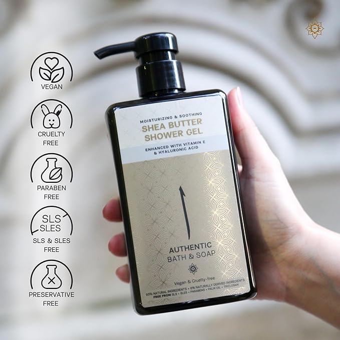 AUTHENTIC BATH & SOAP All Natural - Organic Shea Butter Body Oil with Vitamin E & Hyaluronic Acid, Moisturizing, Hydrating Shower Gel for Men & Women, Cruelty Free & Vegan, Paraben Free 16.9 Fl Oz