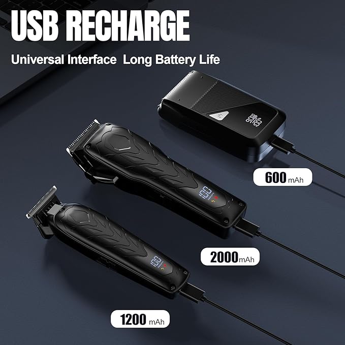 - LONG BATTERY LIFE & LED DISPLAY: The clipper and trimmer are equipped with Long-lasting rechargeable battery with a run time of up to 2-3 hours after 3 hours of charging.Electric shaver which can provide 60 minutes of operation time with only 1.5 hour of charging. LED digital display would show the charging status.During use, the LED display will show the remaining power of the hair clippers, reminding you to charge in time