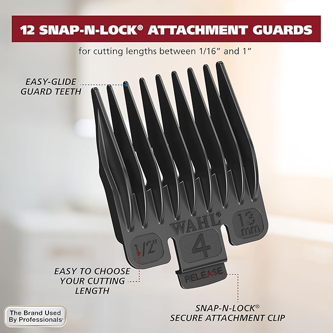 - SNAP-N-Lock Attachment Guards - Kit features 12 smooth cutting hair clipper attachment guards for no-snag, goof proof haircuts ranging in cutting lengths from 1/16” to 1”