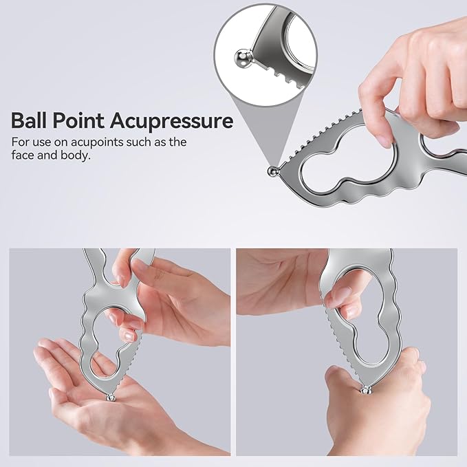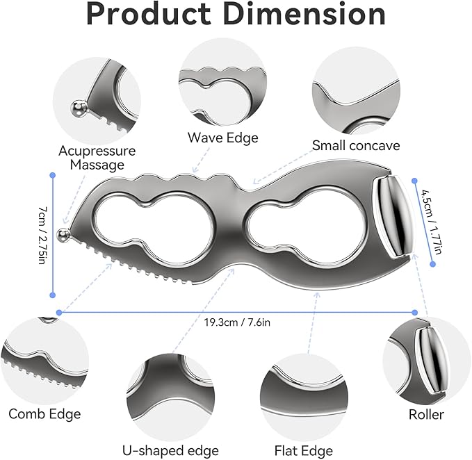 • GUA SHA FACIAL TOOLS - This muscle scraper tool can be used on the face/neck to reduce swelling, contour facial features. Also the metal gua sha can be used on the legs/back to relieve muscle tension, and on the scalp to stimulate hair growth.