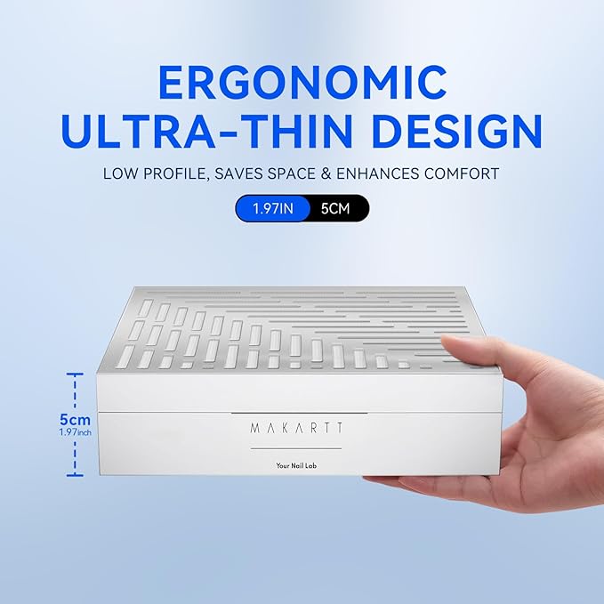 • Ultra-Thin Design: This nail dust collector boasts a sleek, compact profile for convenient portability and space-saving storage. Ultra-thin frame (8.27 x 8.27 x 1.97 inches) keeps hands at a comfortable height. There are cooling holes at both sides and bottom. Rotate the knob clockwise until a click which will indicate startup ( It may take 4-5 seconds).