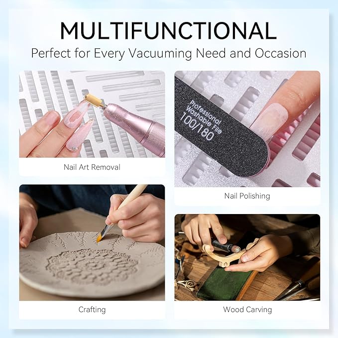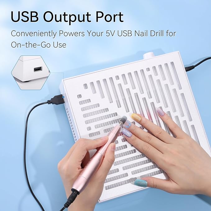 • Reusable Filter & Extra USB Port: Includes a magnetic cover and features a reusable filter for easy cleaning with a hairdryer or dust brush for easy maintenance and cost-effective long-term use. The USB output port powers a 5V USB nail drill machine, adding versatility.