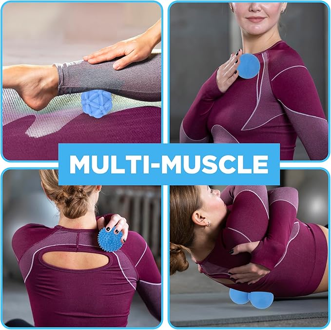 - MASSAGE AT HOME: If you have QLDT Our 4 in 1 massage ball set. you experience muscle soreness and stiffness after a workout,can enjoy the benefits of self-massage at home. This fitness ball set is suitable for neck, back, shoulder massage, tissue massage and trigger point release. This is a great massager to use after stretching, yoga, running, gym workouts or other workout regimens.
