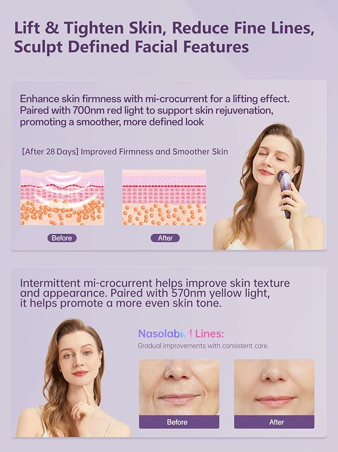 - 6-in-1 Multifunctional Facial Device for Instant Lift & Long-Lasting Firmness: Achieve spa-quality results at home with this all-in-one device. It combines microcurrent, ion cleansing & infusion, vibration, heating, cooling, and 5-color LED light therapy to tighten skin, reduce wrinkles, deeply cleanse, enhance skincare absorption. Experience instant lifting & long-lasting firmness, revealing smoother, firmer, more youthful skin. Ideal for daily use to maintain a vibrant, youthful complexion