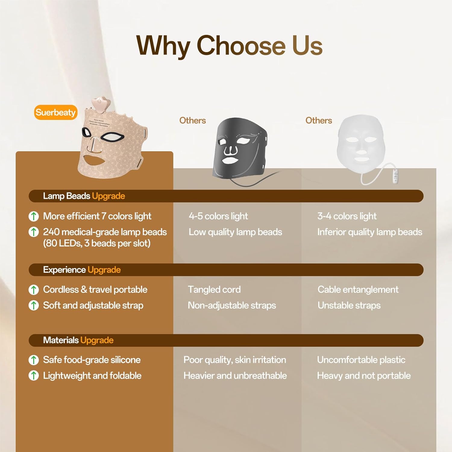 SUERBEATY Red Light Mask, 7 Colors Red Light Mask for Face, Cordless & Portable for Home & Travel, Rechargeable, Lightweight, Facial Skin Care for Women - Mom, Sister, Girlfriend and Wife - Khaki