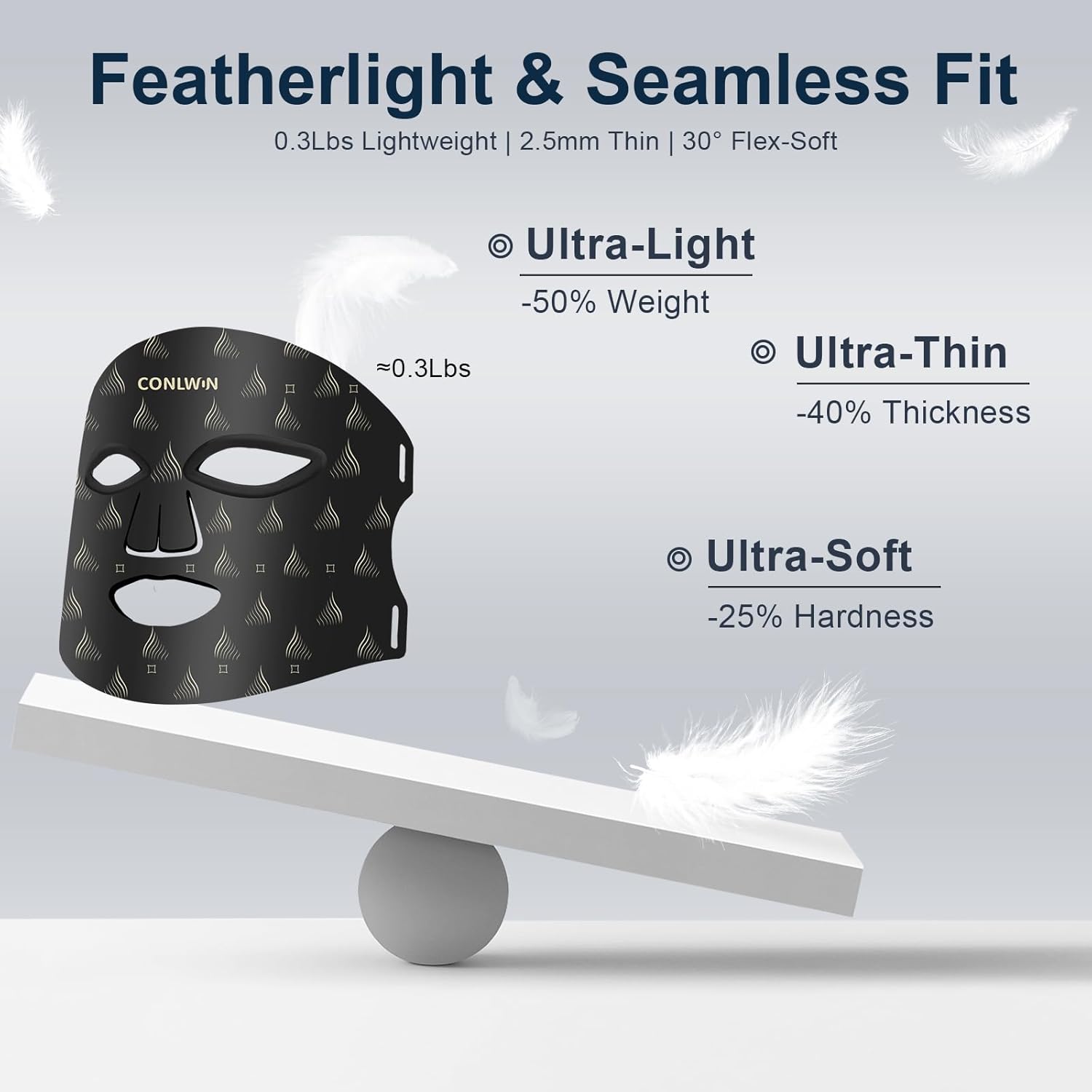- [0.3Lbs Feather-Light Comfort & Portable] Just 0.3Lbs (50% lighter than traditional models) with 2.5mm skin-friendly silicone, this LED face mask offers flexible, irritation-free wear; face-hugging design ensures full skin contact during work breaks, flights, or home use for zero-pressure comfort; foldable and portable, easily slips into carry-ons for on-the-go skincare