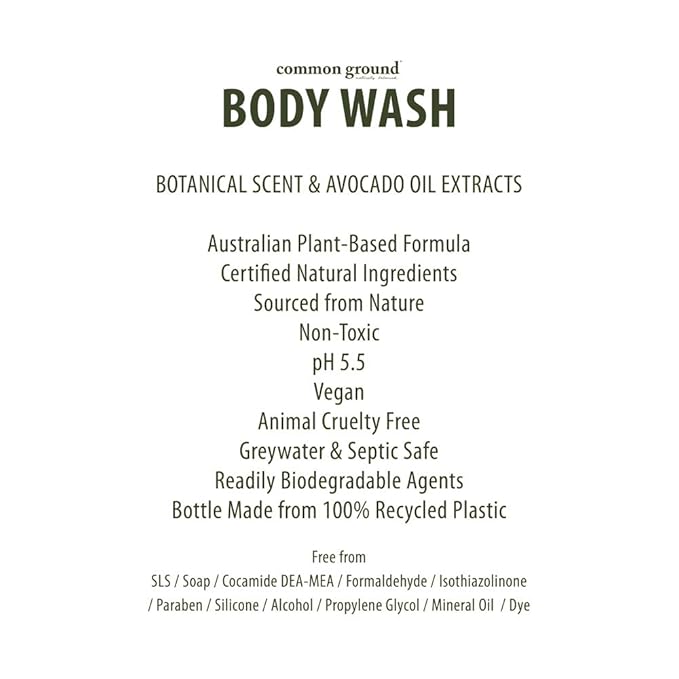 - 🌿 AVOCADO OIL EXTRACTS: Balances & Hydrates your skin. The Common Ground Natural Body Wash uses native avocado oil extracts to cleanse and rejuvenate your skin and bring it back to life. Avocado oil extracts also contain vitamin E, antioxidants, and beneficial fatty acids that help protect your skin from daily pollution