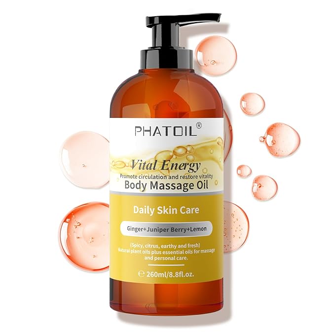 • 【Scent Feature】Vital Energy Body oil is formulated with ginger and juniper berry to restore balance to your body, Fresh lemon oil to moisturize and soften skin for nourishment. Vital Energy body oil is bringing you spicy, citrus, earthy and fresh feeling, which can stimulate blood circulation, make the skin more rosy and healthy, bring vitality and energy