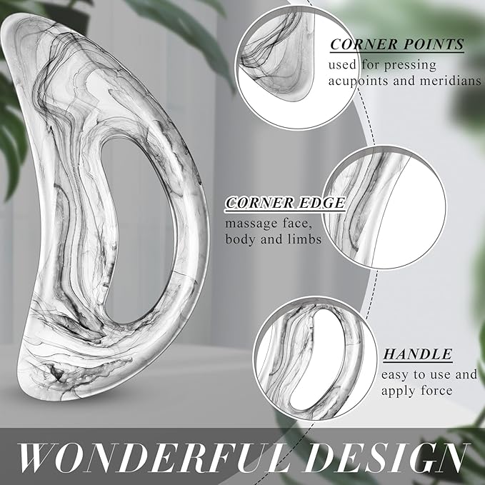 - Body Gua Sha Tool Set: get 2 resin tools (scimitar + heart shape) - the large 8.6" scimitar excels as a back massager, while the heart shape suitable for face/neck; Share with your partner!