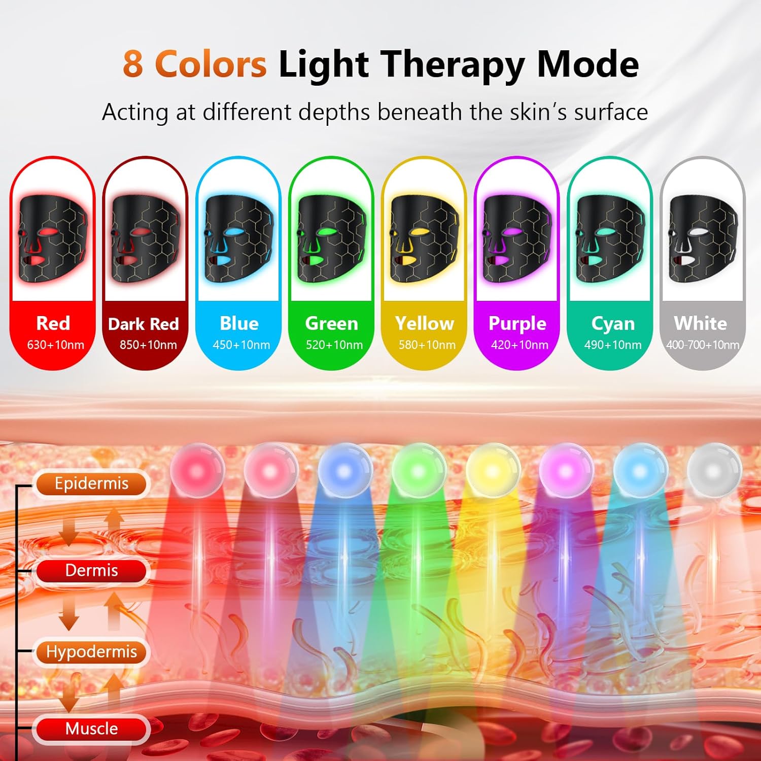 - 🔥【8 Modes Red Light Therapy for Face】 Our red light therapy mask features 4 wavelength—red light (630nm) + near-infrared light (830nm), blue light (460nm) and yellow light (590nm). The combination of red light and near-infrared light which is the best combination to increase skin elasticity and gloss. Blue light can help balance oil secretion. Yellow light helps improve skin redness.