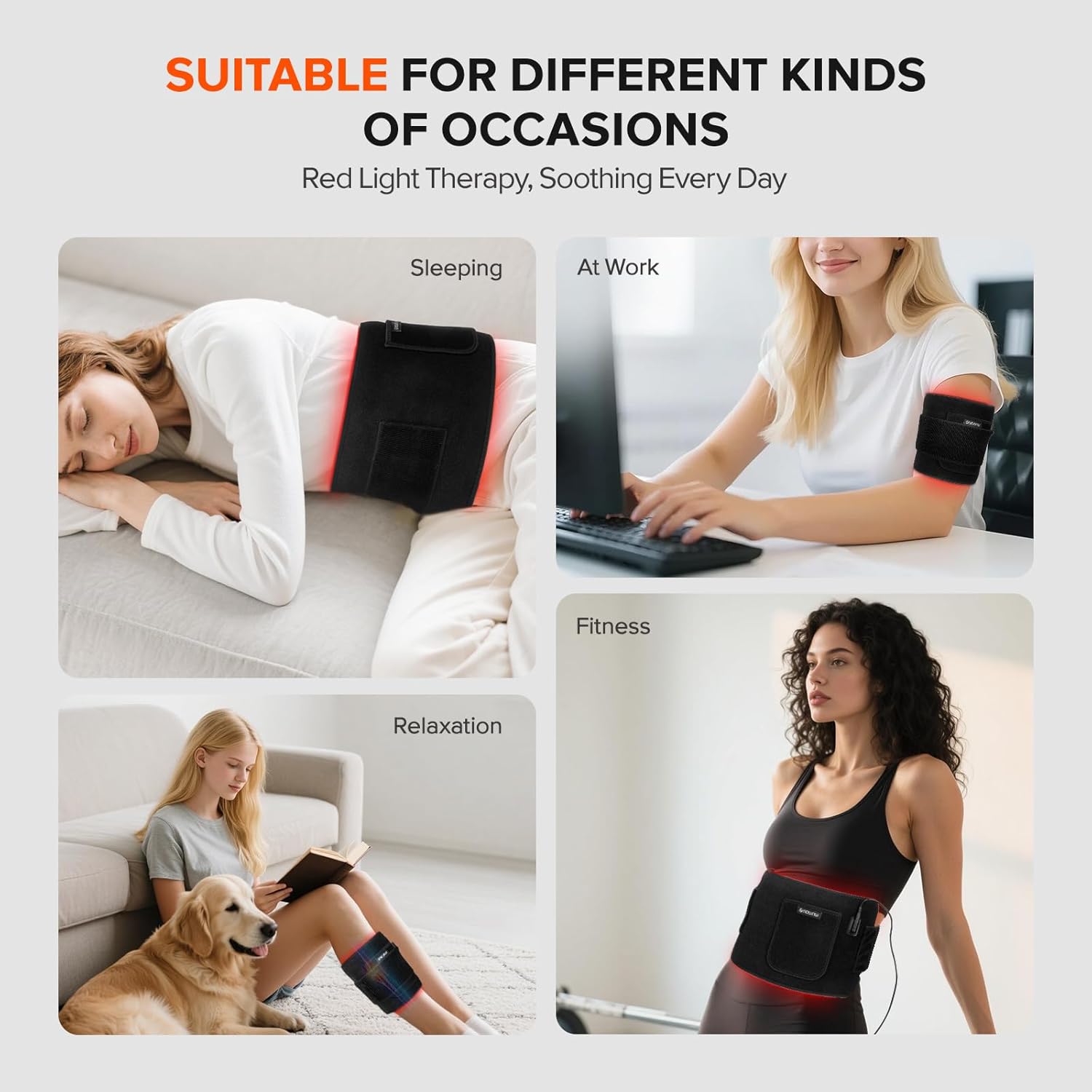 - Multi-Functional & Easy to Use: The 19.6 inch x 8.6 inch red light therapy belt comes with a 31.5-inch extension band, and the red light coverage area is 16.7 inches x 6.4 inches. It can be used on the back, abdomen, waist, shoulders, chest, hands, legs, and more. The body red light therapy mat is also suitable for your pet family members. Additional benefit: The pulse mode's no-heating design eliminates the need for power adjustments, preventing burns to sensitive skin or fur.