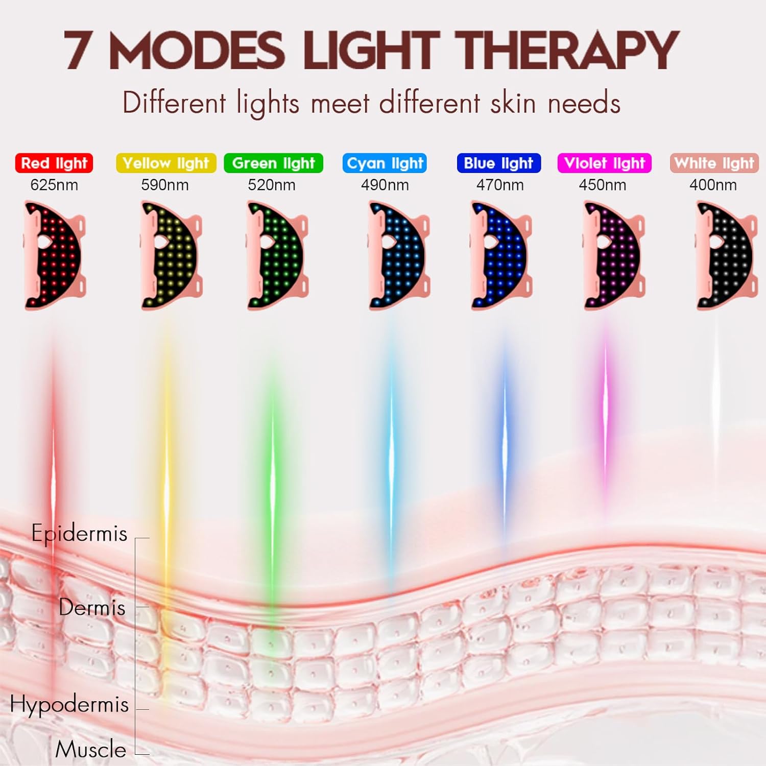 - 7 Modes Red Light Therapy for Face: Near-infrared light (850nm) + red light (625nm), yellow light (590nm), green light (520nm), cyan light (490nm), blue light (470nm), violet light (450nm) and white light (400nm) 7 light modes. The combination of red light and near-infrared light help to smooth the skin, enhance elasticity, and firm the face. Red light therapy mask has 3 levels of brightness, short press to adjust the brightness.