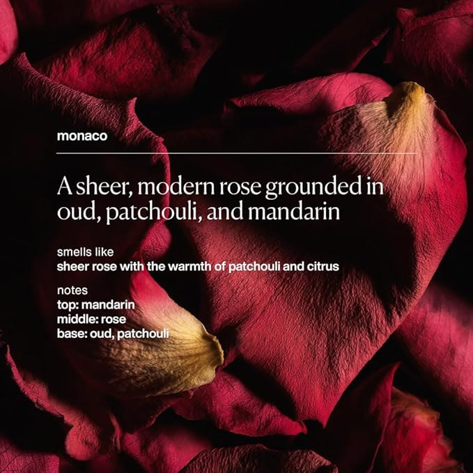 - ROSE, MANDARIN, OUD & PATCHOULI FRAGRANCE: Enjoy the alluring scent of Monaco, a blend of sheer, modern rose grounded in oud, patchouli, and mandarin with our heat activated fragrance.