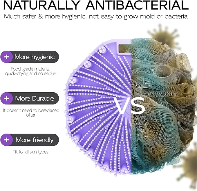 - PORTABLE AND DURABLE: With a convenient hanging hole, our silicone bath scrubber is perfect for home or travel use. The soft silicone bristles and non-slip handle ensure durability and ease of use.
